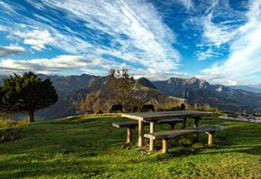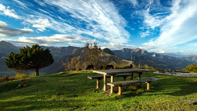 En el Mirador de LLagos, en Rioseco, el paisaje se abre al valle y a las cumbres del Parque Natural de Redes. Un alto con aire limpio para recargar y seguir.